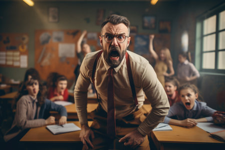 A crazy teacher is furious in class against the background of noisy children
