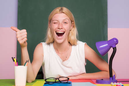 Learn with fun. Funny female teacher sitting at her workplace and teaching English. Happy funny teacher winking. Education concept. Good idea.