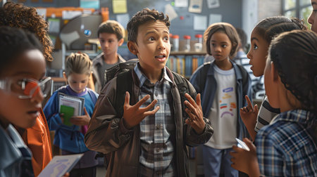 In a classroom, a group of children listens intently as one classmate stands apart, visibly upset and with arms crossed, addressing the others about a difficult situation.