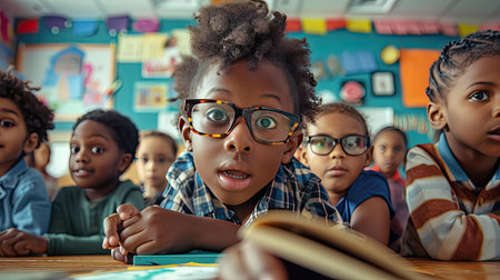 A group of children sitting at desks in a classroom, AI