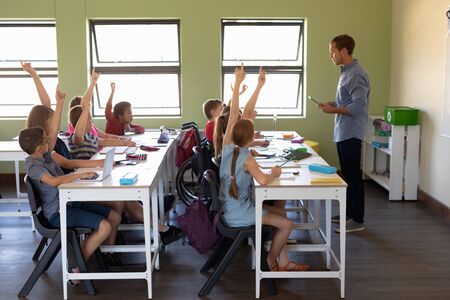 Side view of a Caucasian male school teacher standing in front of the class holding a tablet computer and addressing a diverse group of schoolchildren, sitting at desks and raising their hands to answer a question during a lesson in an elementary school classroom