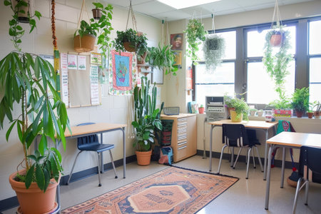 A room teeming with lush plants and a vibrant rug covering the floor, creating a vibrant and natural atmosphere, A classroom decorated with motivational posters and plants