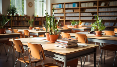 Classroom interior with books and potted plants. Selective focus