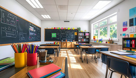 Softly colored cartoon classroom with chalkboard, bookshelves, and pencil cases, everything neat and undisturbed