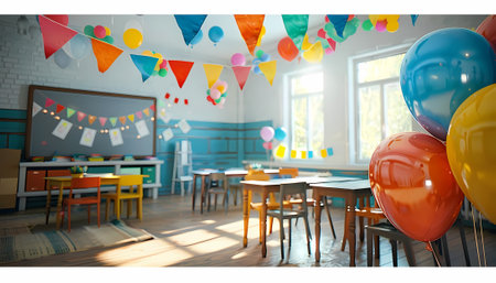 3d rendering of a school classroom interior with balloons and flags.