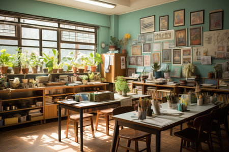 Vibrant classroom with plants and framed artwork.