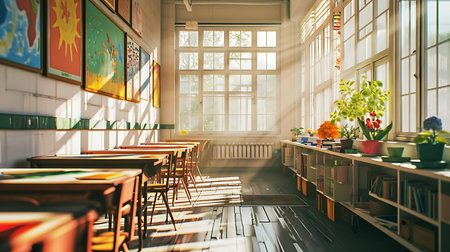 A classroom features wooden desks and chairs arranged neatly with colorful children's artwork adorning the walls. Sunlight streams through the windows, creating a warm atmosphere.