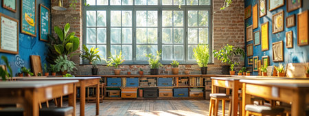 A vibrant and airy classroom setting features wooden desks and a central chalkboard illuminated by natural light, creating an inviting space for educational activities and inspiration.