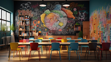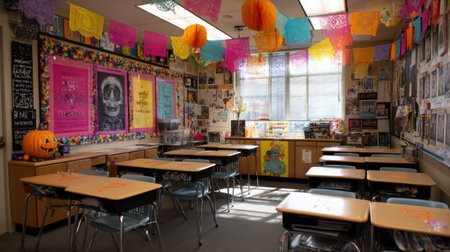 This vibrant classroom showcases a creative learning environment adorned with colorful decorations, posters, and ample lighting, promoting engagement and inspiration.