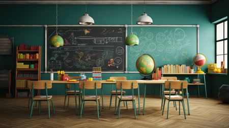 School classroom interior with school supplies and blackboard - 3d rendering