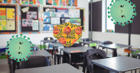 Composition of angry faced covid viruses and flowery face mask over school classroom. school, education and study during covid 19 pandemic concept digitally generated image.
