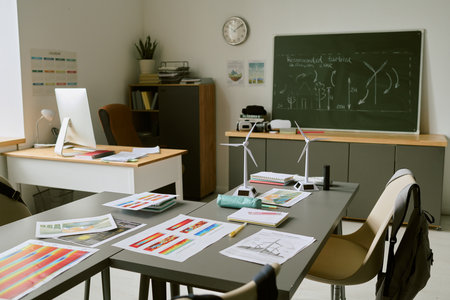 Empty classroom featuring wind turbine models and architectural blueprints on table, chalkboard with renewable energy diagrams in background, modern workspace setup visible