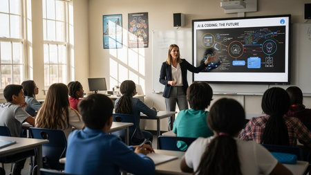 A teacher in a modern classroom explaining AI and coding concepts to students using interactive technology.