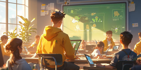 A teacher stands in front of an interactive whiteboard, guiding a group of students seated at desks with laptops, in a well-lit classroom with educational posters and plants.