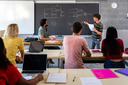 Group of young students sitting at desk in classroom and working together.
