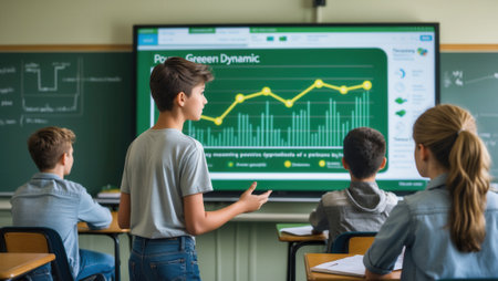 Young student explaining a data chart displayed on a digital screen in a classroom. Classmates seated at desks listen attentively. Educational environment.