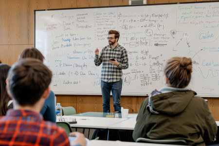 A man standing in front of a whiteboard, giving a lecture in a classroom setting, A professor giving a lecture in front of a large whiteboard filled with equations