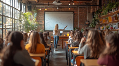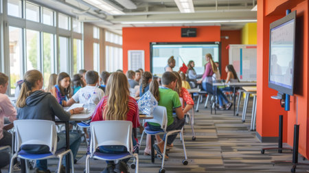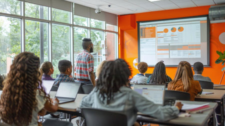 Classroom presentation in modern educational setting with diverse group of students. That the image is generated using AI.