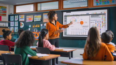 A female teacher actively engages with students in a contemporary classroom setting, utilizing an interactive whiteboard for a presentation while students work on tablets and laptops at their desks, .