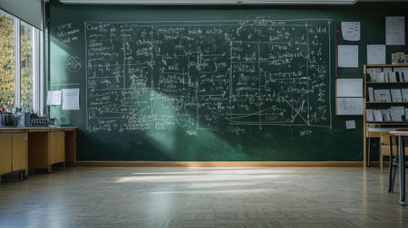 A classroom with a chalkboard featuring intricate equations and diagrams, symbolizing the pursuit of knowledge and the educational journey of students and educators alike.