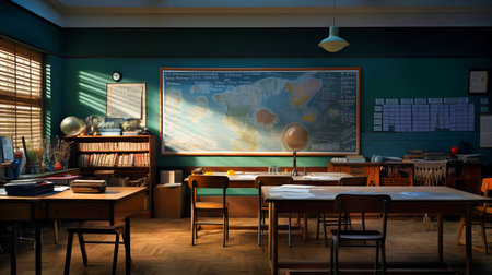 A nostalgic classroom scene featuring wooden desks, blackboards, vintage decor, and natural light, perfect for evoking memories of traditional education and learning spaces.