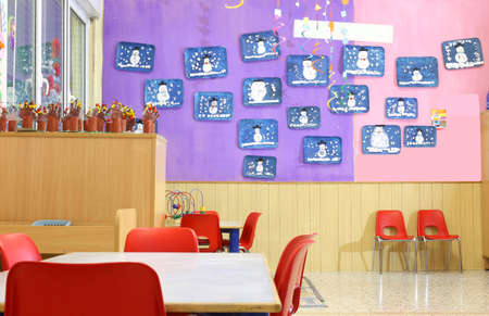 Nursery class with small red chairs and children's drawings on the walls