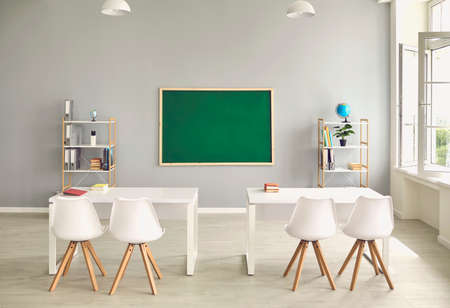 Empty school classroom interior with desks and chairs, empty space for text on chalkboard. Contemporary schoolroom with comfortable furniture