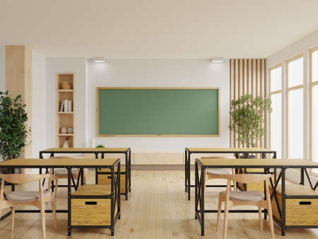 Classroom with school desks and greenboard,empty school classroom.3d rendering