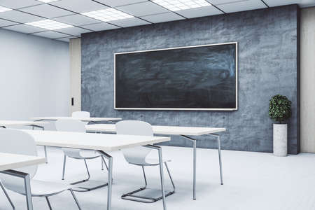 Clean classroom with empty black chalkboard and furniture. Education and school concept. Mock up, 3D Rendering