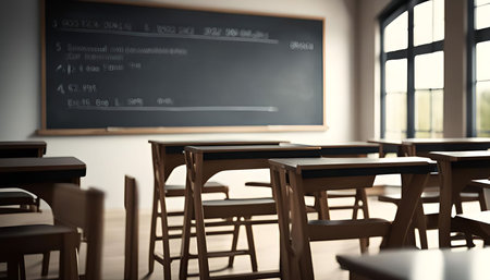 interior of a secondary school class, light from windows and cinematic atmosphere. education and study concept. 3d render. nobody around.