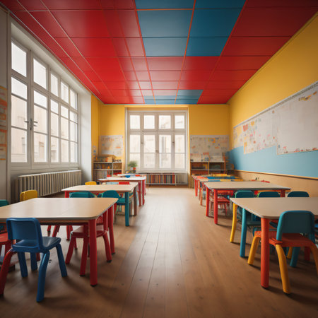 Interior of a school classroom with colorful chairs and tables, 3d render