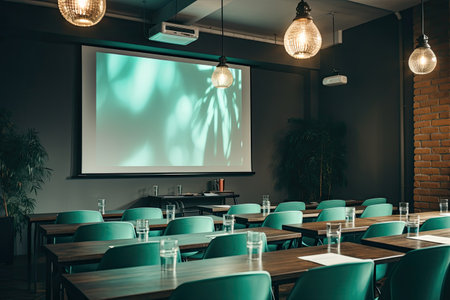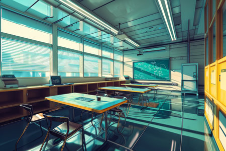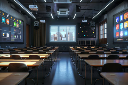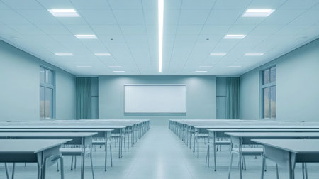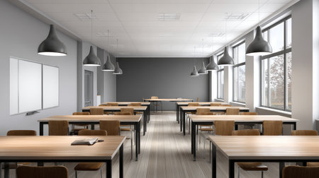 Empty contemporary classroom, devoid of occupants, showcasing modern educational environment and design elements
