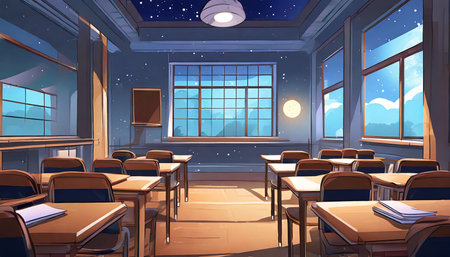 classroom midnight 2d anime background illustration