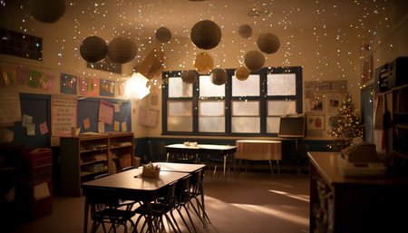 School classroom with many colorful paper lanterns hanging from ceiling in school