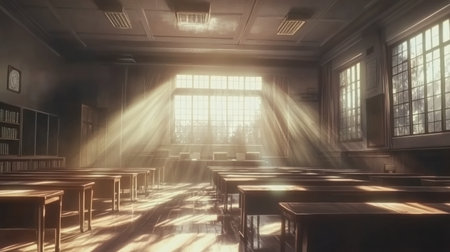 A classroom bathed in sunlight, with sunbeams streaming through the windows and illuminating the desks and chairs. The view outside is a distant landscape, adding a sense of serenity to the room.
