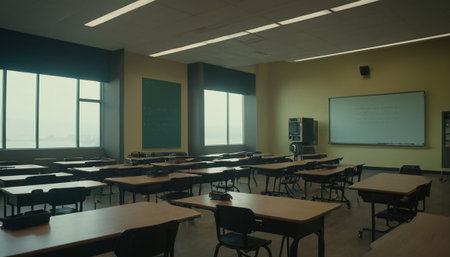 A classroom with a blackboard and desks. Generative AI