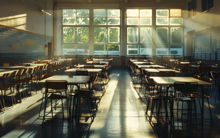 An empty school cafeteria with rows of tables and chairs, bathed in natural light streaming through large windows, creating patterns of shadows on the floor