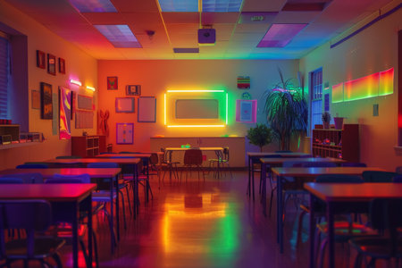 An empty classroom equipped with sensory lighting creating a calming environment for students with special educational needs