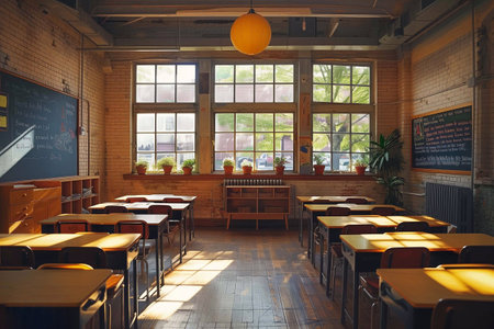 A bright classroom bathed in natural light, featuring wooden desks, a chalkboard, and colorful decorations, perfect for fostering a creative learning experience.