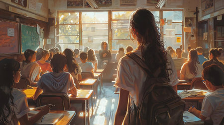 group of students discussing study standing in classroom. ai generated