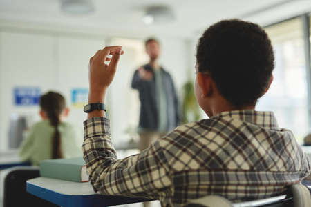 Back view portrait of young black boy raising hand in class and answering questions, copy space