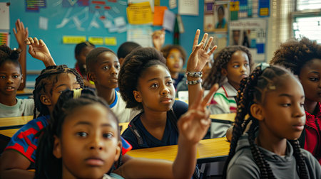 A young student raises their hand in a lively classroom, eager to participate in a discussion. The image captures the spirit of engagement in education.