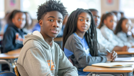 High school students paying attention in class, sitting in their desks and raising hand.