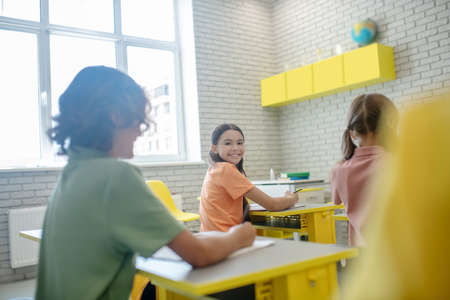 Good mood. Dark-haired girl sitting at the desk in the classroom and smiling to her classmate