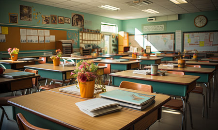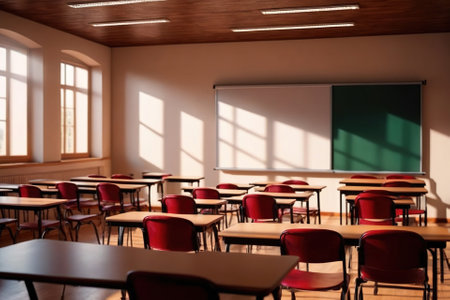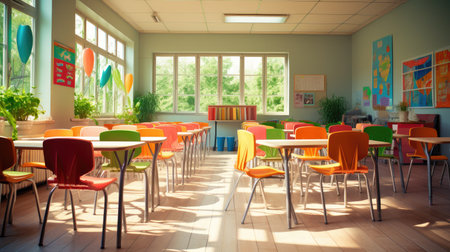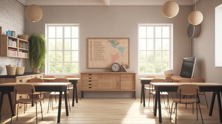 Empty modern classroom with blank whiteboard, bright sunny cheerful education environment
