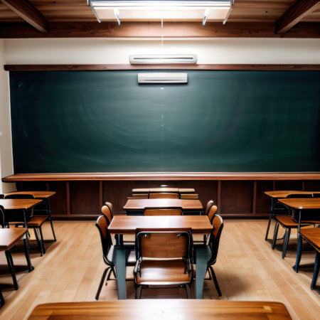 A vintage classroom scene featuring wooden chairs and a classic chalkboard in warm tones, perfect for educational themes, nostalgia, and interior design inspiration.