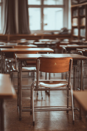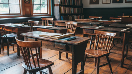 Explore a nostalgic scene of a vintage classroom with wooden desks and chairs, evoking memories of traditional learning in a serene and rustic environment.