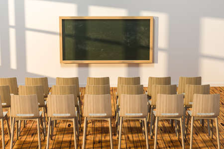 A classroom with chairs inside and a blackboard in the front of the room, 3d rendering. Computer digital drawing.