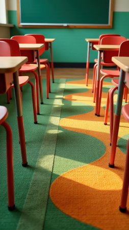 Colorful classroom with red chairs and green accents focused on wavy patterned carpet.
