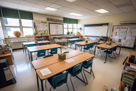 Empty classroom with chairs desks and chalkboard : Generative AI